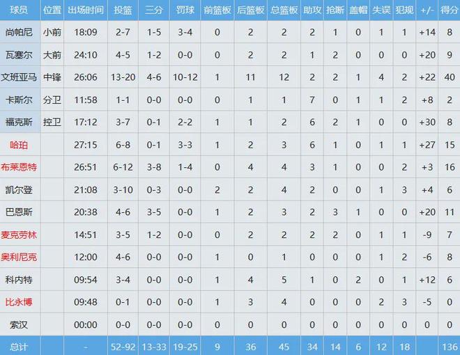 首节八分钟便投篮9中8以接近100%命中率独揽25分,最终文班亚马全场出战约26分钟就爆砍40分12板大号两双,成为NBA史上首位取得该数据的球员。