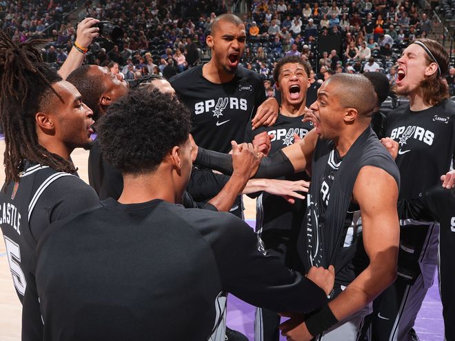 5连胜不算长,但对于这支沉寂多年的西部豪门球队而言却意义非凡。据NBA官网数据统计,马刺队此前6个赛季5+连胜次数为0,这6个赛季都未能打进季后赛。今时不同往日,这支西部豪门球队正在超级崛起,未来可期!截至目前,马刺队以37胜16负排在西部第2位,仅落后西部第1的雷霆队(41胜13负)3.5个胜场,领先西部第3的火箭队(33胜19负)3.5个胜场。在这个过程中,马刺队还完成了4杀卫冕冠军雷霆队的壮举,联盟独此一份,让人叹为观止。马刺队超级崛起,文班亚马绝不是一个人在战斗,福克斯、卡斯尔、哈珀三后卫宛如三驾马车驱动进攻,凯尔登、瓦塞尔、尚帕尼等锋线悍将干脏活累活,马刺团队篮球魅力四射,攻守均衡,进攻效率(116.7)排在联盟第9位,防守效率(110.9)排在联盟第3位。