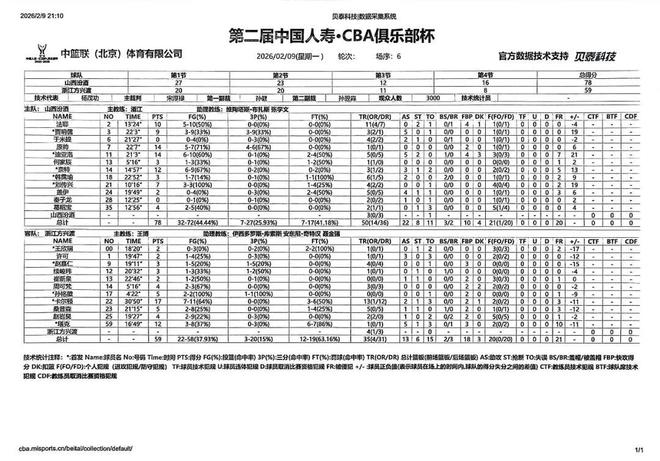 北京时间2026年2月9日19:30,第二届中国人寿·CBA俱乐部杯半决赛继续进行,山西汾酒在内蒙古体育馆,迎战浙江方兴渡。本场比赛,山西队准备充分,篮板球拼抢积极,进攻也比较耐心,最终顺利取胜,但全队需摆正心态。正如潘江指导赛后所说,大家一定要保持清醒,对手大部分主力缺阵,需要继续认真总结,准备接下来的决赛。最终全场比赛结束,山西汾酒78:59战胜浙江方兴渡。