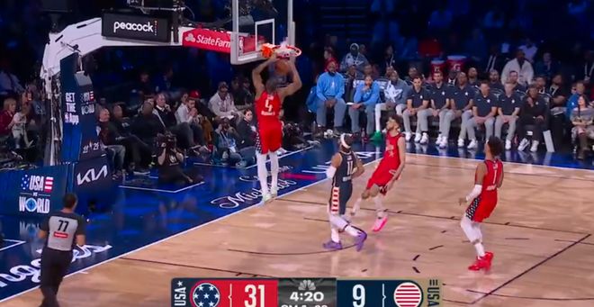 之后新星队开始提速,华子接球回传马克西,马克西上篮遭遇詹姆斯追帽,裁判吹罚干扰球,新星队5-1反超。布克推过来传篮下大空位杜伦,助其轻松扣篮,比分7-1;星条队这边,老詹控球过来左翼单挑杜伦,底线出手未果,杜兰特补篮板后突开布克上篮,被坎宁安盖帽,马克西收板长传,布克左翼三分命中,新星队10-1扩大领先,随后马克西再借失误上篮得手,12-1打停星条。