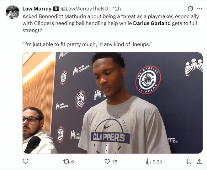 快船新援马瑟林谈到加兰还无法登场,他表示:我基本上可以在任何阵容中找到自己的位置,球队需要我做组织核心时我就会去做,尤其是在加兰缺席快船需要加强控球能力的情况下。