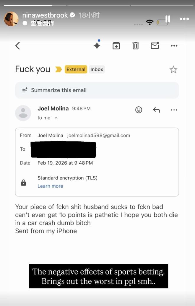 北京时间2月21日,NBA球员拉塞尔-威斯布鲁克的妻子妮娜-威斯布鲁克分享了她在丈夫周四晚比赛后收到的一封来自球迷的恶毒电子邮件。