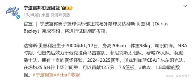 另外,值得一提的是,2000年出生的贝兹利,今年也才只有26岁,正值职业生涯上升期。虽然此前他曾遭遇伤病侵蚀,不过,总体恢复情况还算不错。在对抗不算太激烈的CBA联赛,贝兹利应该没啥问题。而在贝兹利加盟以后,宁波队将如虎添翼,在三号位又增强了筹码。看样子,宁波队本赛季确实要冲击季后赛,甚至是成为CBA本赛季第一黑马。