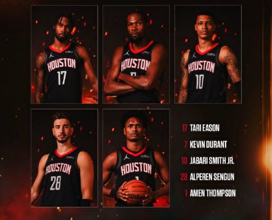 火箭:杜兰特、贾巴里-史密斯、阿门、申京、伊森