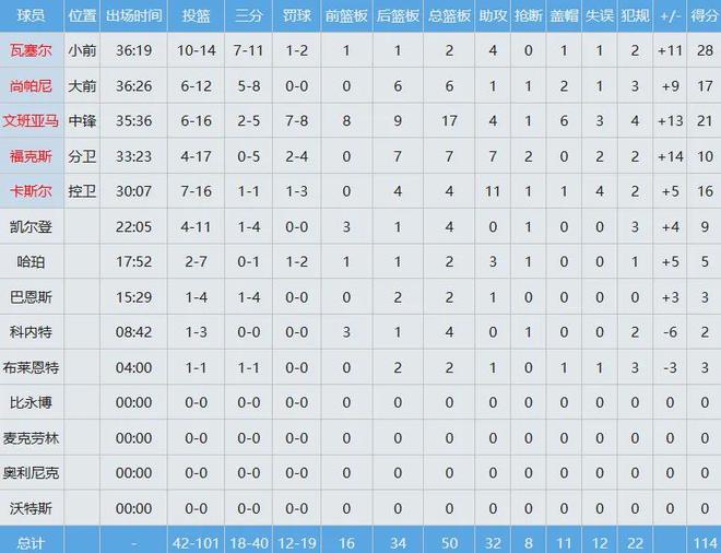 全场下来,文班亚马出战约36分钟,独揽21分17板(8前场板)4助6帽全面数据,而他在九连胜期间的场均数据为24.9分12板3.4助1.3断3.4帽,可能已是当今联盟攻防兼备最出色的球员,没有之一。