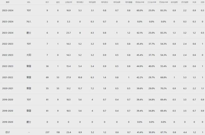 常规赛出战237场首发118次,场均上阵23.7分钟拿到8.9分5.2板1.2助进账,三项命中率41.4%、30.9%和67.7%;季后赛出战七场,场均上阵18分钟收获6.6分6.7板,三项命中率41.9%、50%和90%。