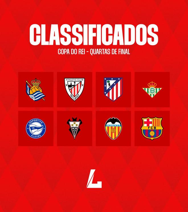 国王杯八强:巴塞罗那、马德里竞技、毕尔巴鄂竞技、皇家社会、皇家贝蒂斯、瓦伦西亚、阿拉维斯、阿尔瓦塞特(西乙)