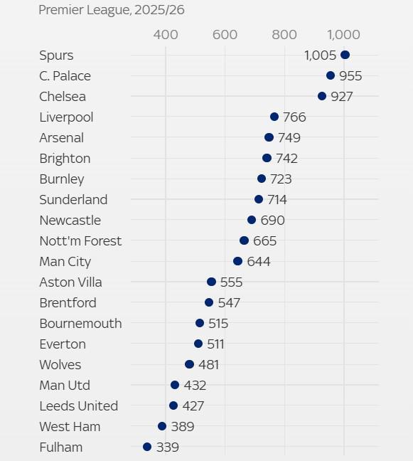 据天空体育的统计报道:热刺球员本赛季因伤病和疾病累计缺阵天数已达1005天,这一数字在英超所有球队中高居榜首。
