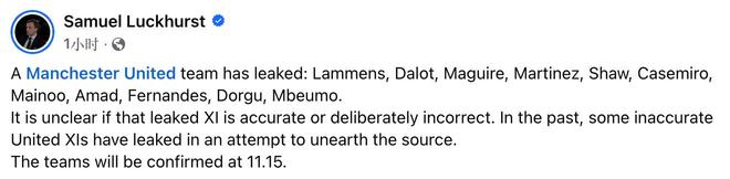 Samuel Luckhurst在公布这份首发时表示,目前尚不清楚这份泄露的首发名单是否正确。过去,曾有一些不正确的曼联首发名单被提前泄露出来,目的是找出其来源。