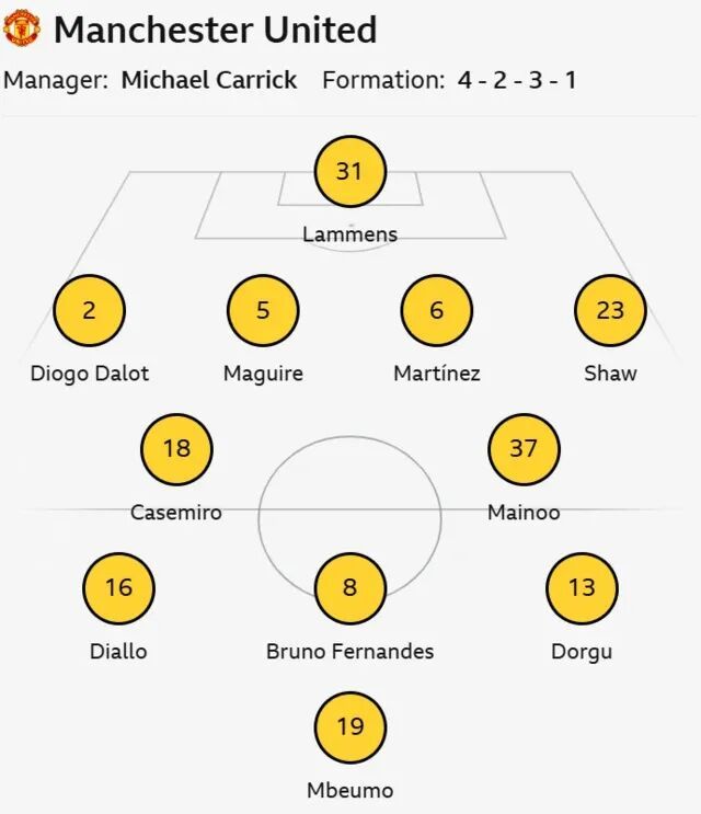 正如赛前预测,卡里克采用了4231阵型,布鲁诺·费尔南德斯回到10号位,与阿马德·迪亚洛、多古和姆贝莫组成无锋阵型,卡塞米罗和科比·梅诺搭档后腰,迪奥古·达洛、马奎尔、利桑德罗·马丁内斯和卢克·肖联袂防线,门将仍是塞纳·拉门斯。