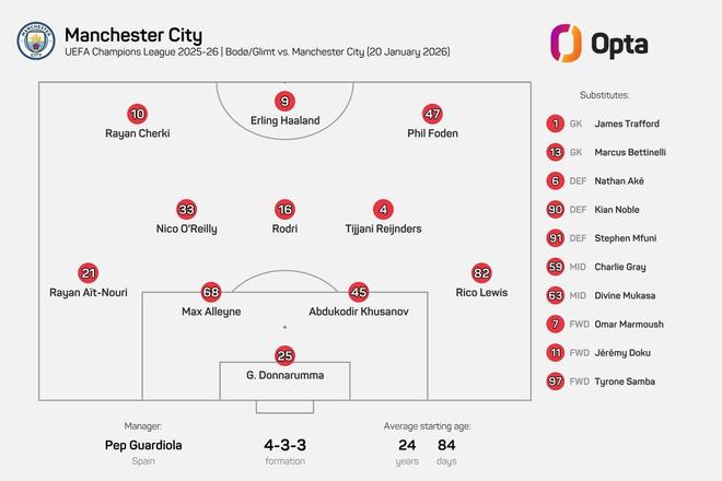 多纳鲁马(26岁);里科-刘易斯(21岁)、胡桑诺夫(21岁)、马克斯-阿莱恩(20岁)、艾特-努里(24岁);赖因德斯(27岁)、罗德里(29岁)、尼科-奥赖利(20岁);福登(25岁)、哈兰德(25岁)、谢尔基(22岁)