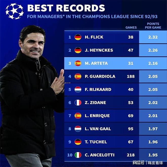 根据《德国转会市场》的统计,执教欧冠场次超过25场的主帅当中,阿尔特塔31场得到67分,场均得分2.16分,排在第三名,比曼城主帅瓜迪奥拉还要高一点。对于一名执教经历不长的主教练来说,真的很不容易。