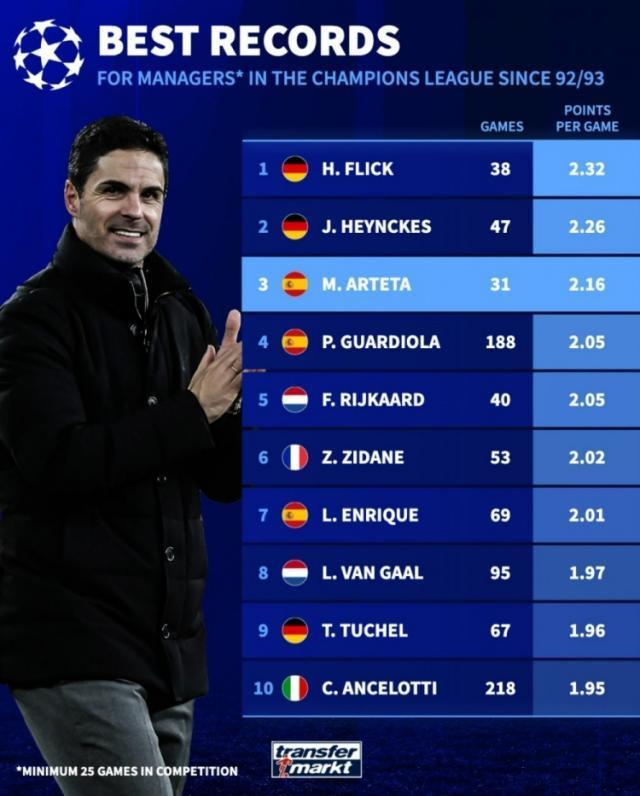 1月21日讯 德转盘点了自92/93赛季欧冠改制以来,至少带队25场的主帅中场均积分榜,其中弗里克居首,具体如下: