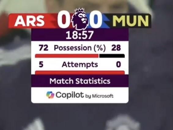 比赛开局阶段阿森纳占据绝对优势,根据前19分钟的技术统计,阿森纳的控球率高达72%,曼联仅为28%,前19分钟枪手还尝试了5脚射门,而红魔的射门次数仍为0。