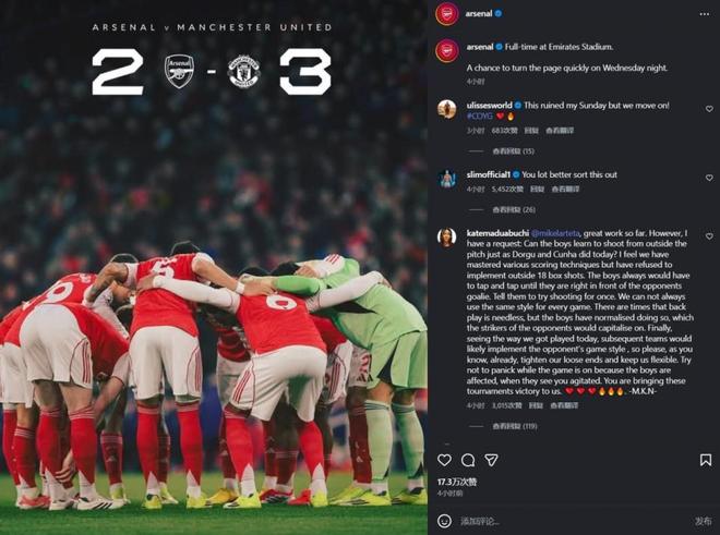 赛后,阿森纳社媒发布战报,配文称:周三晚上我们将迎来一个迅速翻开新的一页的机会。尽管阿森纳官推这条动态原本想鼓励全队重拾斗志,但却并没有得到球迷的共鸣。