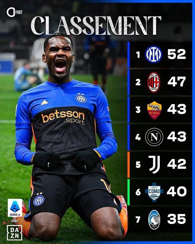 目前的积分榜里,国米以52分排在榜首,拥有5分的优势,米兰47分排在第二,领先第三名罗马4分,前三名之间有两个小的积分断档。而从第三名罗马到第六名科莫之间则只有3分分差,也就是名次每一轮都有可能发生变化,之后第七名的亚特兰大距离身前的科莫也有5分的差距。按照目前这个积分形势解读,米兰双雄应该算是意甲冠军的最有力争夺者,而身后的罗马、那不勒斯、尤文和科莫则要争夺剩余的两个前四名额,亚特兰大表现好也能加入欧战名额的竞争。