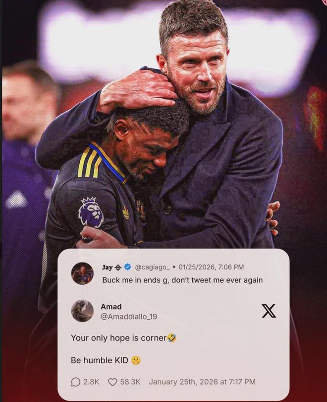 曼联球星阿马德-迪亚洛在推上回复了一名枪迷,他写道:“你们唯一的希望也就是角球了(笑哭),谦虚点吧孩子。”