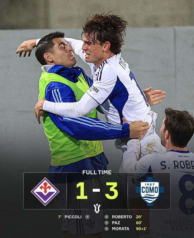 此后,佛罗伦萨试图通过换人加强进攻,但阵型前压的同时,后防也暴露出越来越多的空当。第90+1分钟,科莫打出快速反击,尼古拉斯-库恩送出精准直塞,33岁的皇马旧将莫拉塔冷静前插,在十二码附近迎球推射破门,3-1,彻底锁定胜局。最终,科莫客场3-1逆转佛罗伦萨,成功晋级意大利杯八强。从被动落后,到完成逆转,再到锁定胜局,法布雷加斯执教水平真的越来越强了,看来又有豪门要来挖人啦!