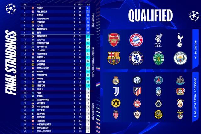 此役过后,本赛季欧冠出线格局正式明朗,16强席位确定8队:阿森纳、拜仁慕尼黑、利物浦、托特纳姆热刺、巴塞罗那、切尔西、葡萄牙体育、曼城。