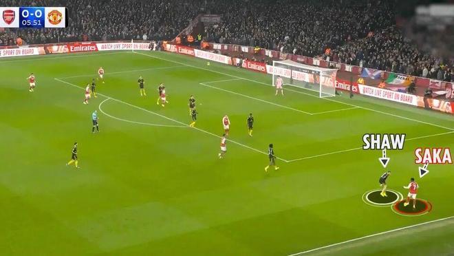 曼联边卫卢克·肖和迪奥古·达洛在外侧跑位,迫使阿森纳边锋不得不跟人,这样的牵制,让红魔中场始终多出一人。
