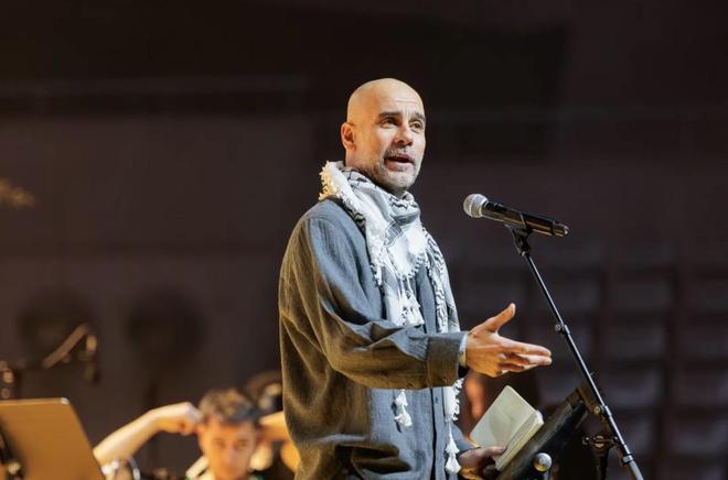 当地时间周四晚上,瓜迪奥拉回到他的家乡巴塞罗那,在一场慈善音乐会上发表演讲,声援巴勒斯坦儿童。