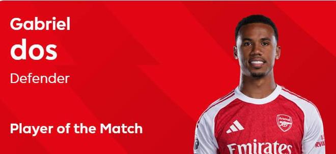 赛后,他以54%的得票率当选英超官方本场比赛最佳球员。此外,加布里埃尔还有60次触球,40次传球32次成功,10次长传4次成功,完成了1次射门并射正,2次被对手犯规。