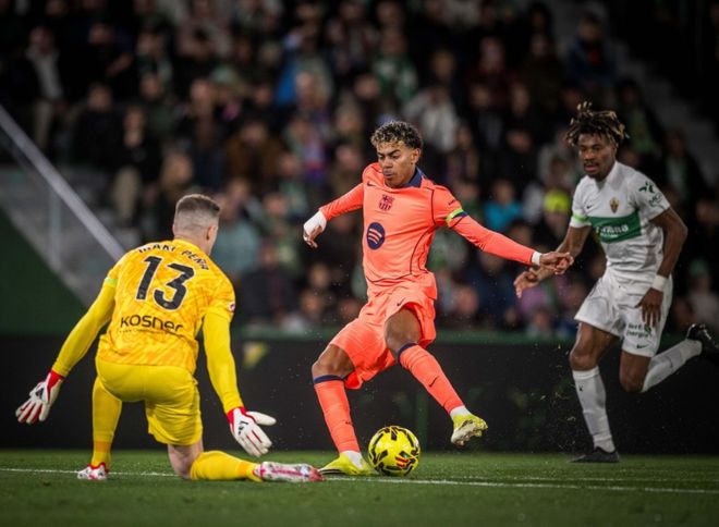 面对本赛季首回合交锋,1-3败在自己脚下的埃尔切,弗兰克在客场沿用了433的阵型,霍安加西亚镇守龙门,孔德、库巴西、加西亚和巴尔德构筑后防,费尔明、德容和奥尔莫坐镇中场,锋线三叉戟则是亚马尔、费兰和拉菲尼亚。