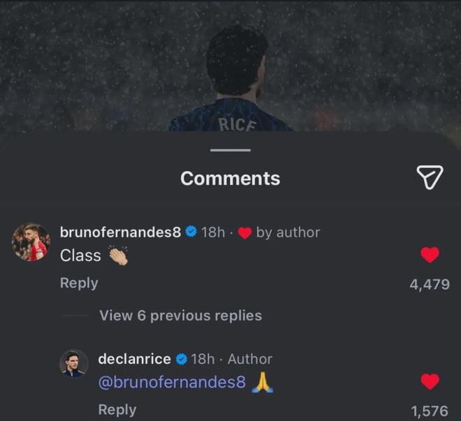 曼联队长B费在IG上致敬了赖斯的英超300场里程碑。