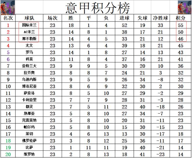 积分榜方面,本轮前三全部赢球,AC米兰就还是差国米5分位列第2,那不勒斯落后国米9分排在第3,第4的尤文则是落后国米10分。博洛尼亚惨败后无力回前8,排在第10。