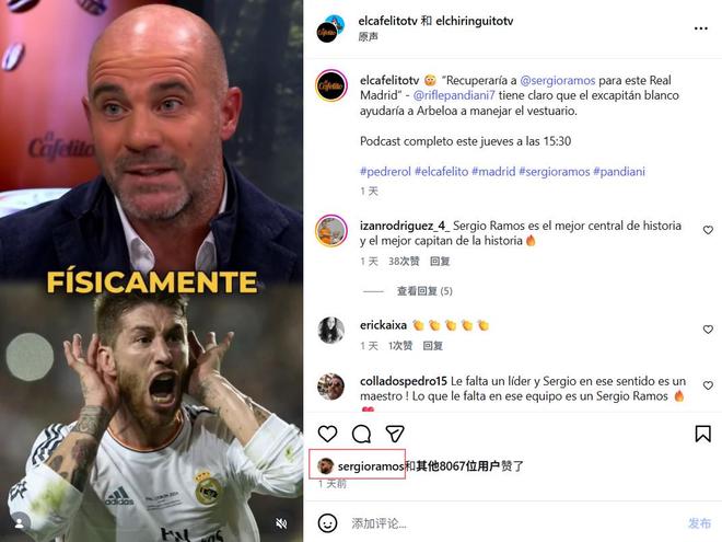 前西甲球星表示皇马应召回拉莫斯,拉莫斯点赞了这条帖子