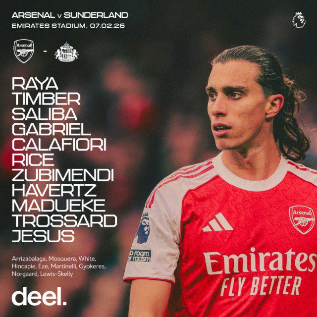 英超第25轮,阿森纳主场对阵桑德兰,赛前阿森纳首发阵容出炉,具体名单如下: 阿森纳首发:拉亚 / 廷伯、萨利巴、加布里埃尔、卡拉菲奥里 / 赖斯、苏维门迪、哈弗茨 / 马杜埃凯、热苏斯、特罗萨尔