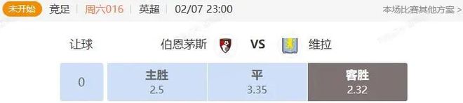 目前竞彩数据来看,给出对维拉一定的倾斜,无视伯恩茅斯的连胜,对维拉的客场依旧期待,本场看维拉不败、客胜值得一搏。