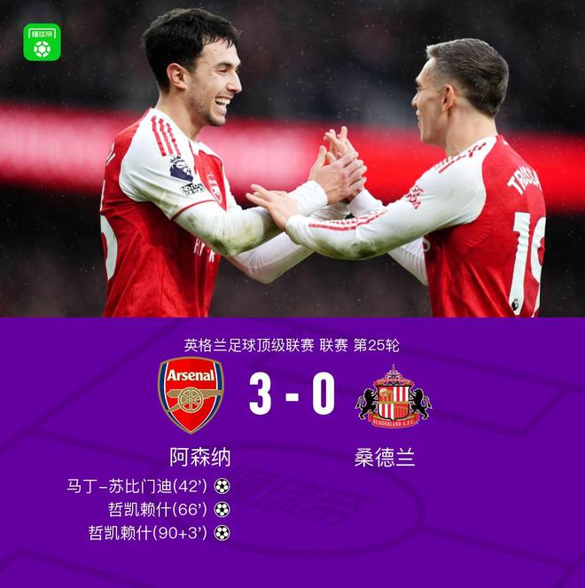 北京时间2月7日英超联赛第25轮,阿森纳主场对阵桑德兰。苏比门迪贴地远射先拔头筹,哲凯赖什替补登场完成梅开二度,哈弗茨兜射造险。最终,阿森纳主场3-0完胜桑德兰,继续强势领跑。