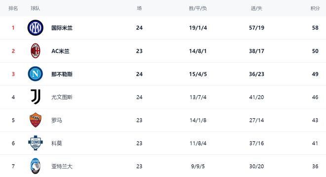 在积分榜上,国际米兰一枝独秀,19胜1平4负的成绩非常亮眼,拿到58分高居榜首。而AC米兰只拿到50分。虽然AC米兰少赛一场,但与国际米兰这么大的差距想要追上去难度极高。那不勒斯只拿到49分,排名第3,争冠希望极其渺茫。尤文图斯战平后,总积分达到46分,排名第4。罗马以43分排名第5。科莫则以41分排名第6。亚特兰大只拿到36分,排名第7。而错失胜利的拉齐奥只拿到33分,排名第8。