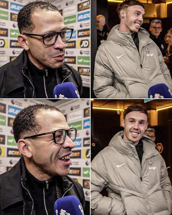 3-1击败狼队赛后,切尔西主帅罗塞尼尔接受了采访,采访过程中,罗塞尼尔被在一旁听他采访的帕尔默逗笑。