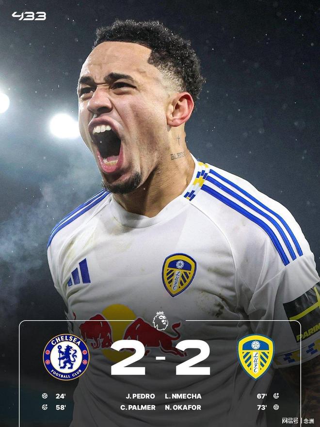 切尔西主场2-2战了利兹联,英超4连胜终结。若昂-佩德罗破门+造点,帕尔默主罚扩大比分,凯塞多送点,恩梅查点射,奥卡福扳平,补时阶段帕尔默失空门。