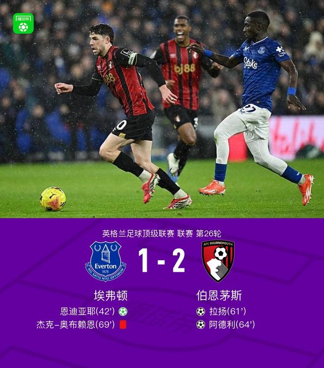 北京时间2月11日英格兰足球顶级联赛 联赛 第26轮,埃弗顿主场对阵伯恩茅斯。埃弗顿恩迪亚耶破门。上半场,恩迪亚耶主罚点球命中打破场上平衡。下半场,拉扬接特吕费尔的传球将比分扳平。随后,希尔助攻阿德利破门将比分反超。第69分钟,奥布赖恩放倒阿德利破坏单刀机会被直红罚下。最终,伯恩茅斯2-1逆转埃弗顿,客场全取三分。