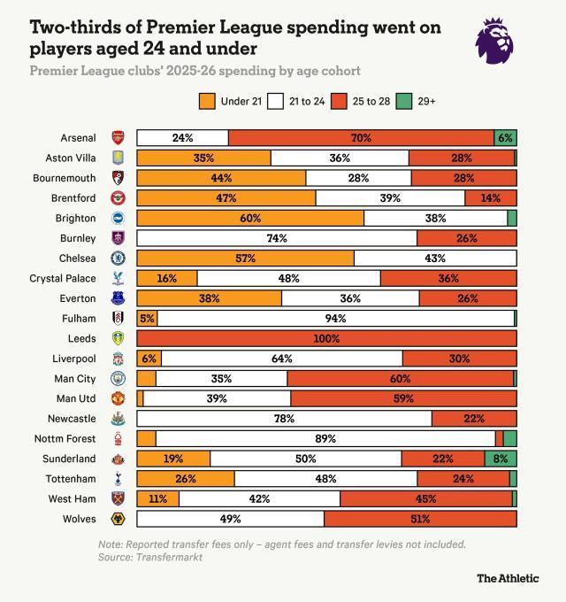 02月10日讯 TA统计了20支英超球队本赛季在新援上花费的超过35亿英镑(47.5亿美元)之后,我们按俱乐部进行了细分,并将他们的支出划分为四个明确的年龄段:21岁以下、21至24岁、25至28岁,以及29岁及以上。从整体来看,49%的支出流向了21至24岁年龄段的球员,这是该年龄段连续第八个赛季占据转会费支出的最大份额。