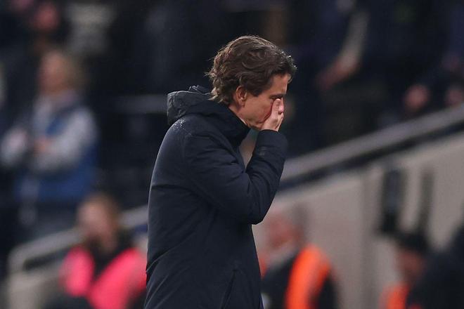 热刺开场就尽显慌乱,安东尼・埃兰加的角球砸在德拉古辛膝盖上,险些吊射入网。随后维卡里奥出击接高球出现致命失误,引来主场球迷漫天嘘声。