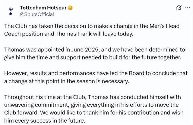 官宣!弗兰克下课,欧冠第4,英超8场0胜,热刺支付800万镑解约金