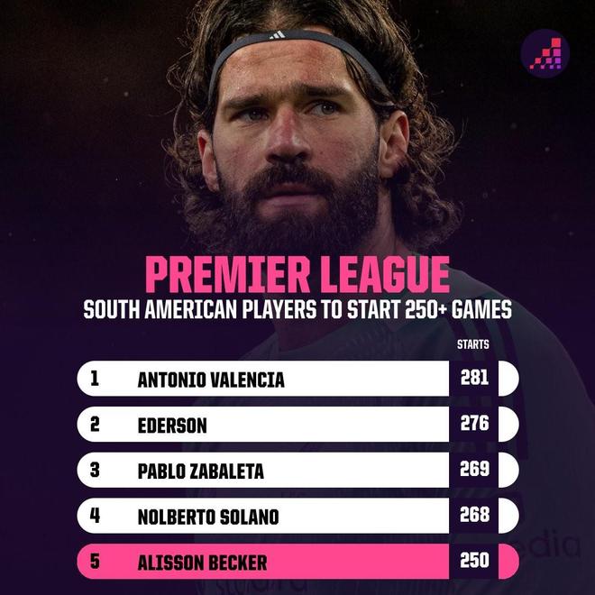 英超第26轮,利物浦客场对阵桑德兰,利物浦门将阿利松迎来英超生涯第250次出场,成为第五位达成这一里程碑的南美球员。