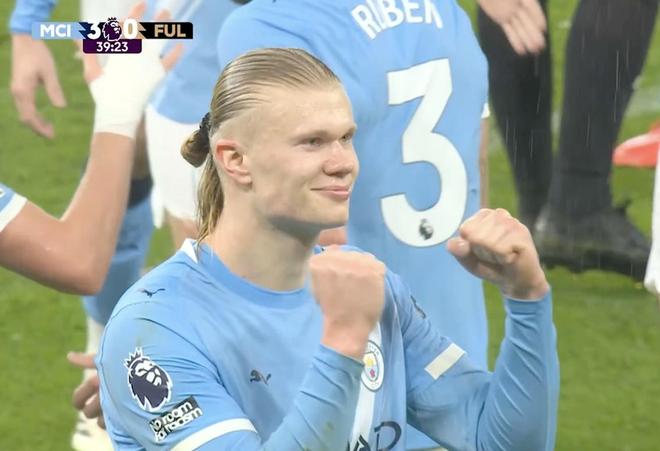 此役主场对阵富勒姆,哈兰德在比赛第39分钟打入一球,帮助曼城取得3-0领先。