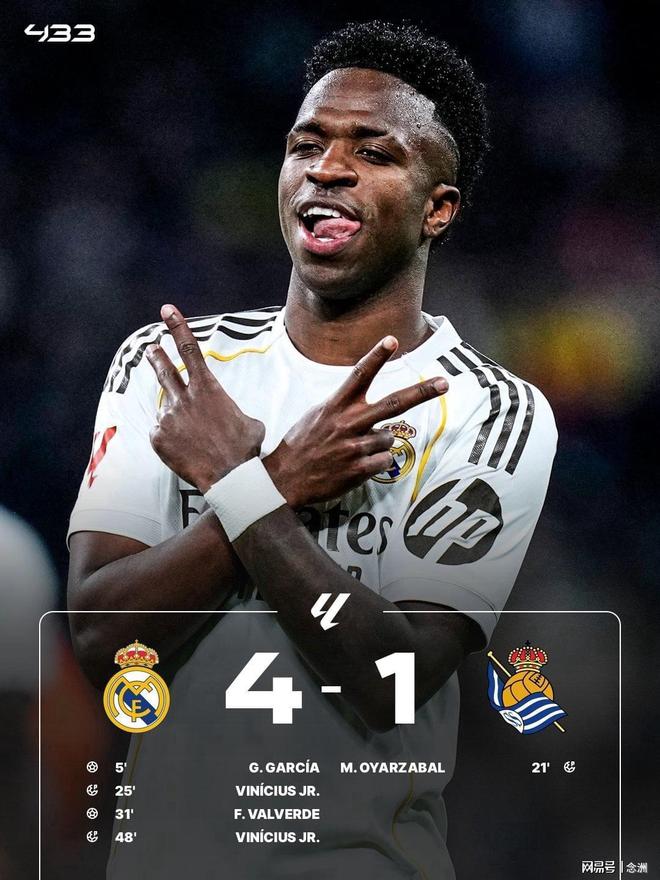 西甲第24轮,皇马主场4-1击败皇社,先赛60分登顶。阿诺德妙传助攻贡萨洛先拔头筹,赫伊森送点,奥亚萨瓦尔点射扳平,维尼修斯两次造点+点射,巴尔韦德远射破门。