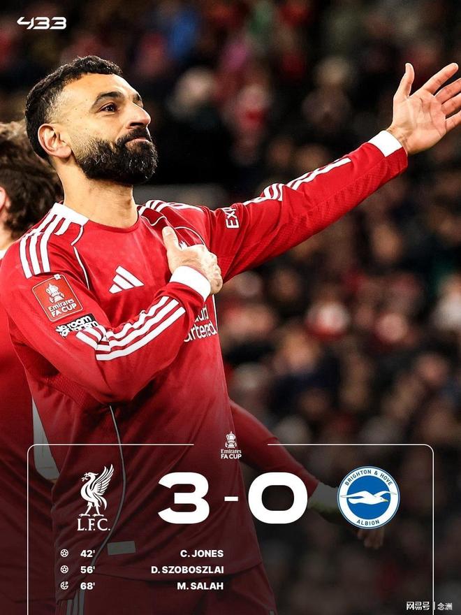 足总杯第4轮,利物浦主场3-0击败布莱顿,晋级16强。加克波打进一球,但是越位在先,凯尔凯兹助攻琼斯破门。索博斯洛伊扩大领先优势,萨拉赫造点并亲自主罚命中。