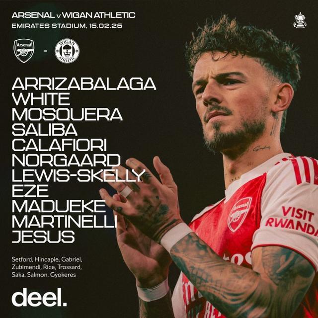 阿森纳vs维冈竞技:热苏斯、埃泽首发,斯凯利、内尔高出战