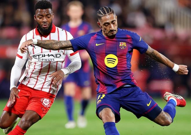 比赛开打后,赫罗纳没有意外摆出大巴反击态势,巴萨场面上明显有优势,却迟迟未能进球;第16分钟,巴萨后场断球反击,亚马尔迅速前插速度优势摆渡维特塞尔形成单刀捅射被出击的加萨尼加扑出;第22分钟,维特塞尔中线精准上抢分到右路,齐甘科夫右路直塞,瓦纳特前插低射被霍安-加西亚化解。第27分钟,赫拉德-马丁拦截断球直传,拉菲尼亚推进到弧顶处直接远射擦着横梁出界;第43分钟,亚马尔斜传,拉菲尼亚打门击中立柱;半场结束前,布林德禁区内防守放倒了奥尔莫,巴萨获得点球机会,然而亚马尔的点射却不偏不倚再次打在了立柱上!
