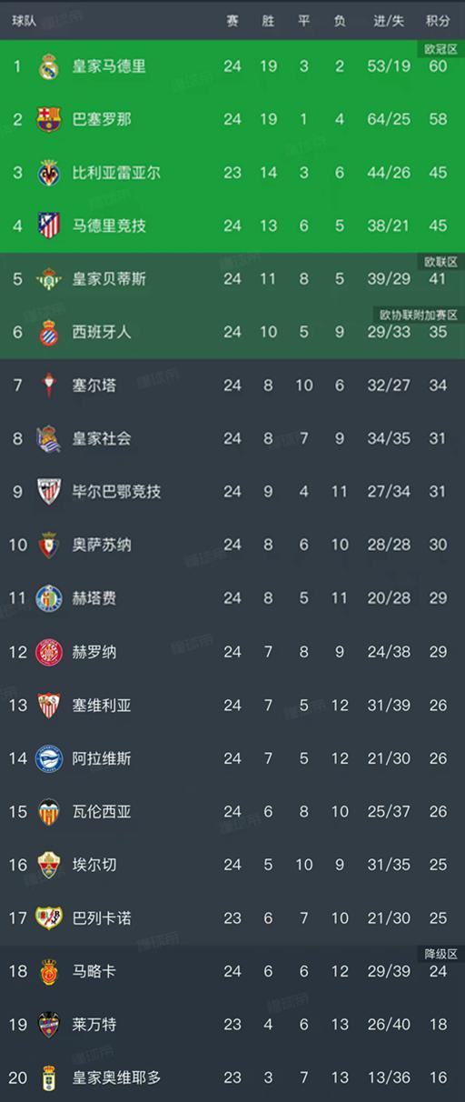 北京时间2月17日,随着巴萨1-2爆冷不敌赫罗纳,西甲第24轮的比赛全部结束,最新排名出炉,巴萨的积分停留在58分,落后皇马2分,丢掉榜首,皇马重新回到了领头羊的位置,比利亚雷亚尔和马竞分列第三和第四的位置!
