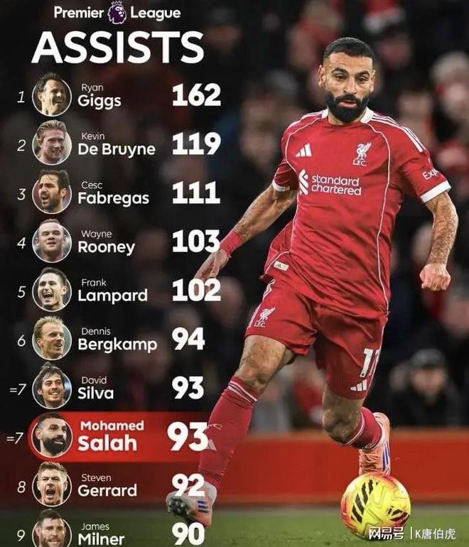 在最近6场的比赛中,萨拉赫只打进了2个进球,但却贡献了4次助攻,不得不说他正在积极转变自己在场上的角色定位,既然无法再继续承载那个绝对爆点,那么后撤位置成为组织者也未尝不可。据统计,萨拉赫目前已经完成了93次助攻,这也让他排在了英超历史助攻榜单的第7名,甚至是比利物浦传奇队长杰拉德还要多1次助攻。