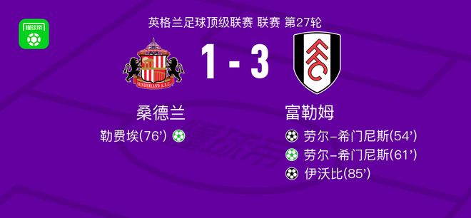 北京时间2月22日英超联赛 第27轮,桑德兰主场对阵富勒姆。劳尔-希门尼斯梅开二度,伊沃比传射建功,勒费埃点射破门难救主。最终,桑德兰主场1-3不敌富勒姆。