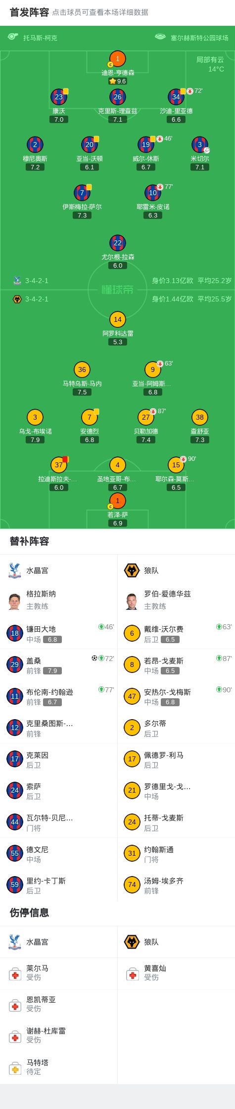 水晶宫1-0十人狼队,盖桑绝杀,阿罗科达雷丢点
